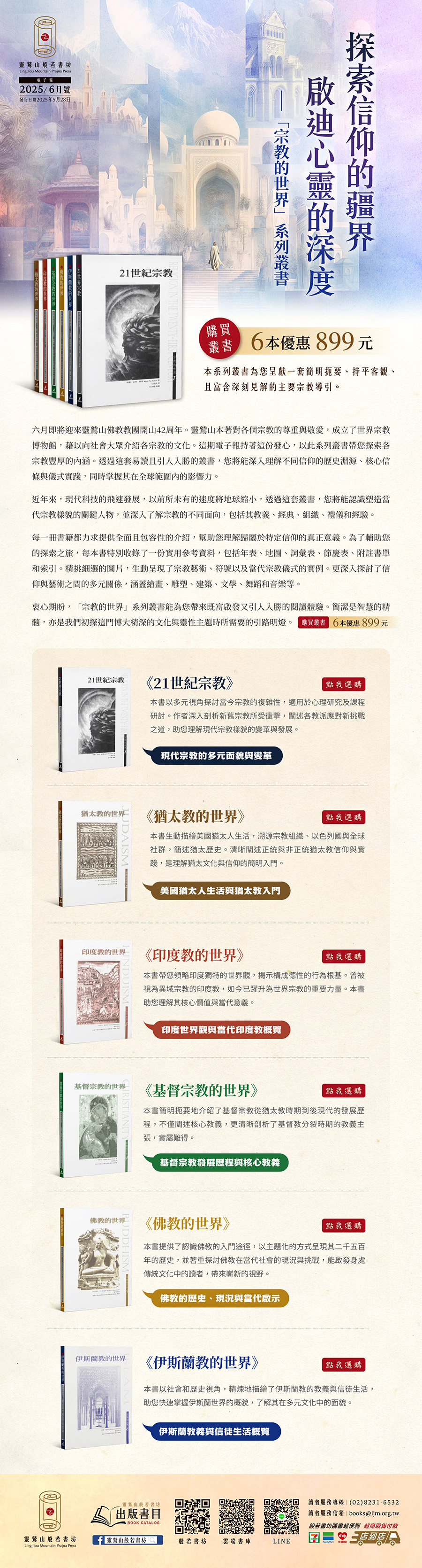 靈鷲山般若書坊 靈鷲山般若書坊 出版書目 靈鷲山般若書坊FB 讀者服務信箱 宗教的世界系列(一套六本) 購買叢書 購買叢書 21世紀宗教 點我選購 猶太教的世界 點我選購 印度教的世界 點我選購 基督宗教的世界 點我選購 佛教的世界 點我選購 伊斯蘭教的世界 點我選購