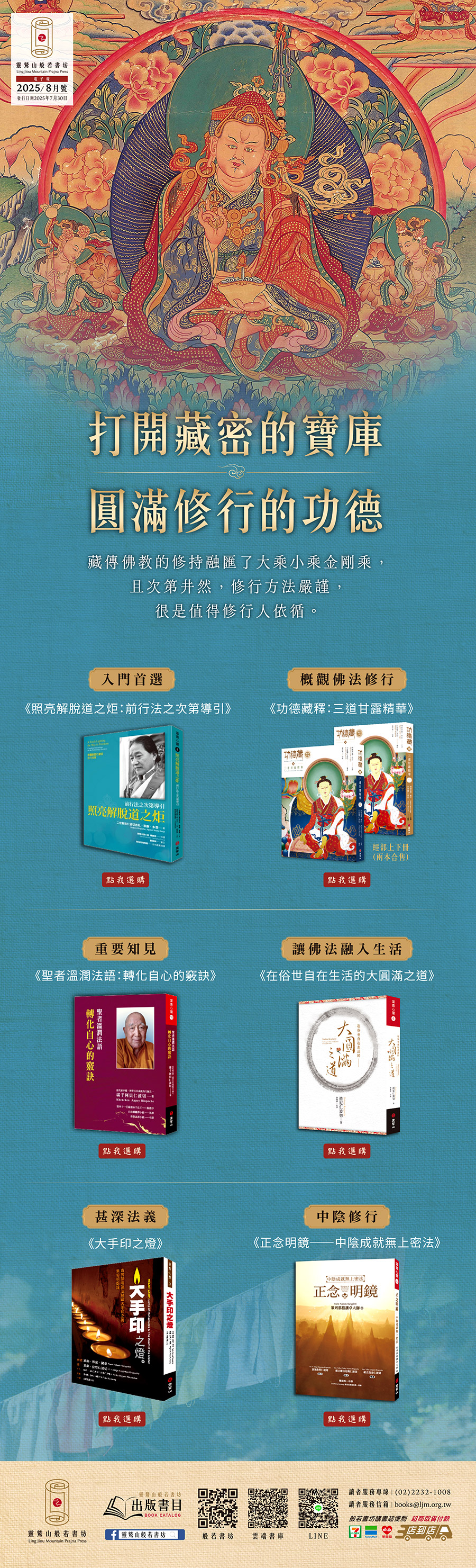 靈鷲山般若書坊 讀者服務信箱 靈鷲山般若書坊FB 出版書目 靈鷲山般若書坊 照亮解脫道之炬:前行法之次第導引 點我選購 功德藏釋:三道甘露精華 點我選購 聖者溫潤法語:轉化自心的竅訣 點我選購 在俗世自在生活的大圓滿之道 點我選購 大手印之燈 點我選購 正念明鏡── 中陰成就無上密法 點我選購