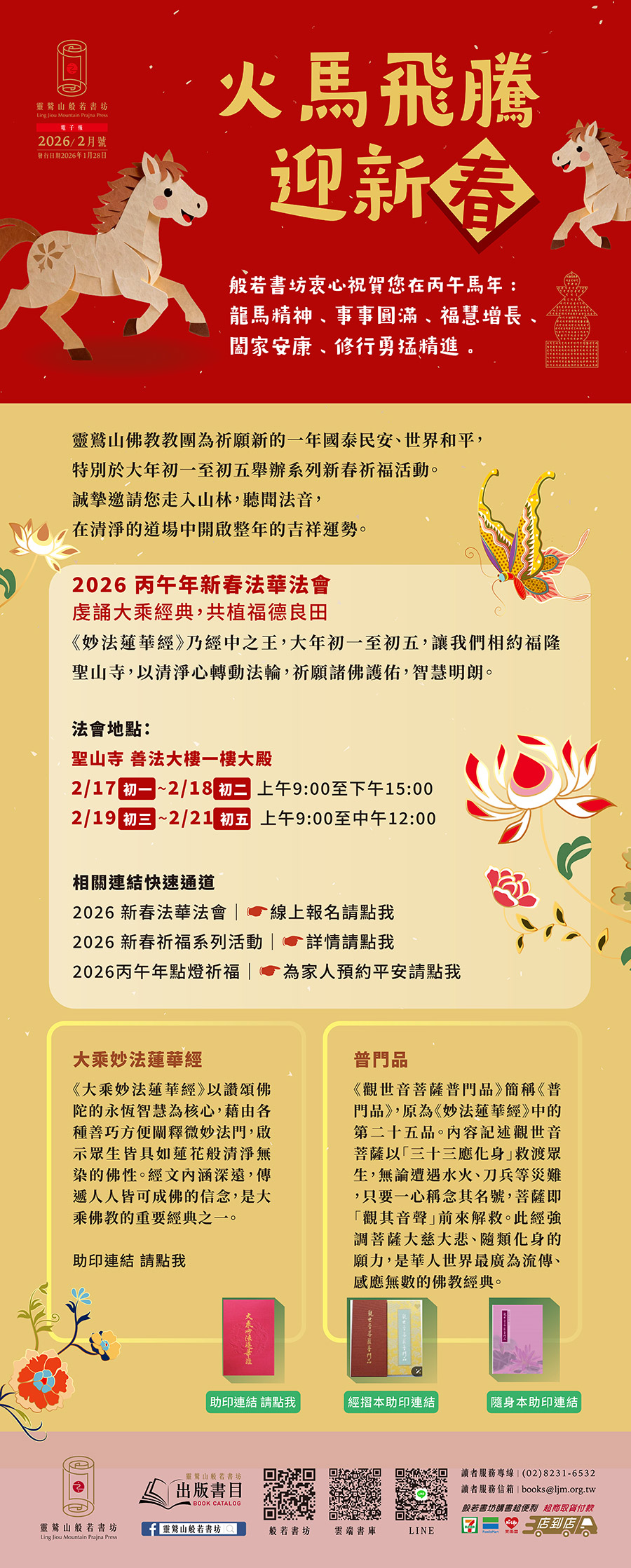 靈鷲山般若書坊 讀者服務信箱 靈鷲山般若書坊FB 出版書目 靈鷲山般若書坊 線上報名請點我 詳情請點我 為家人預約平安請點我 助印連結請點我 經摺本助印連結 隨身本助印連結
